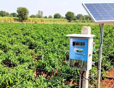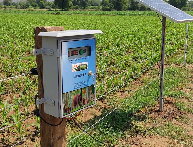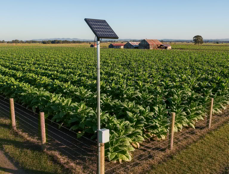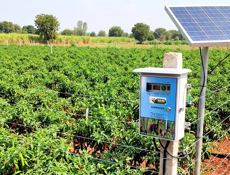 Durable solar fencing securing agricultural lands against wild animals and stray livestock, ensuring crops and property remain safe.